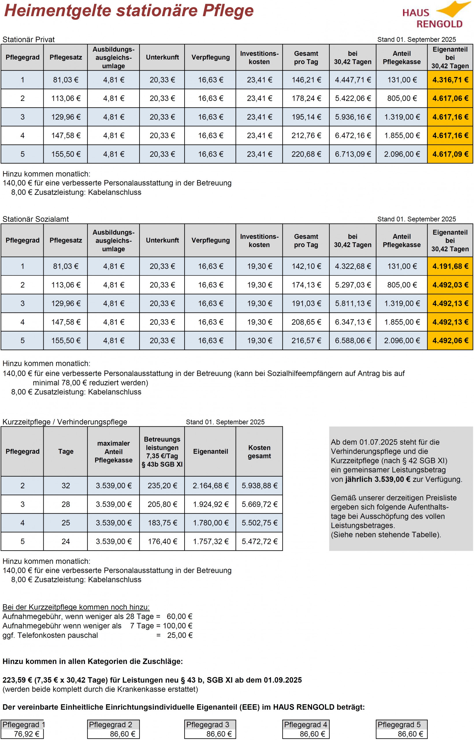 In diesem PDF-Dokument finden Sie die Preise für die stationäre Pflege und auch für die Kurzzeitpflege, sowie weitere Erläuterungen. Bitte untenstehenden Link anklicken: